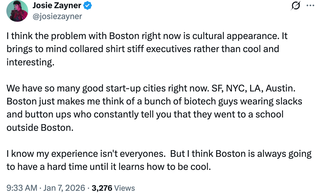 Boston, like its dominant industries, is deeply uncool and allergic to fun. Boston is full of stuck up nerds that are too smart for their own good looking down on literally everyone. Anything exuberant, playful, weird, ambitious, or even a little bit silly is shunned and shamed. There is a deeply ingrained belief that good work should be serious and silent, buttoned up, and absolutely not fun, and that by extension, if you’re having fun and telling people about it you must be up to no good. Why would anyone want to come and build with us?